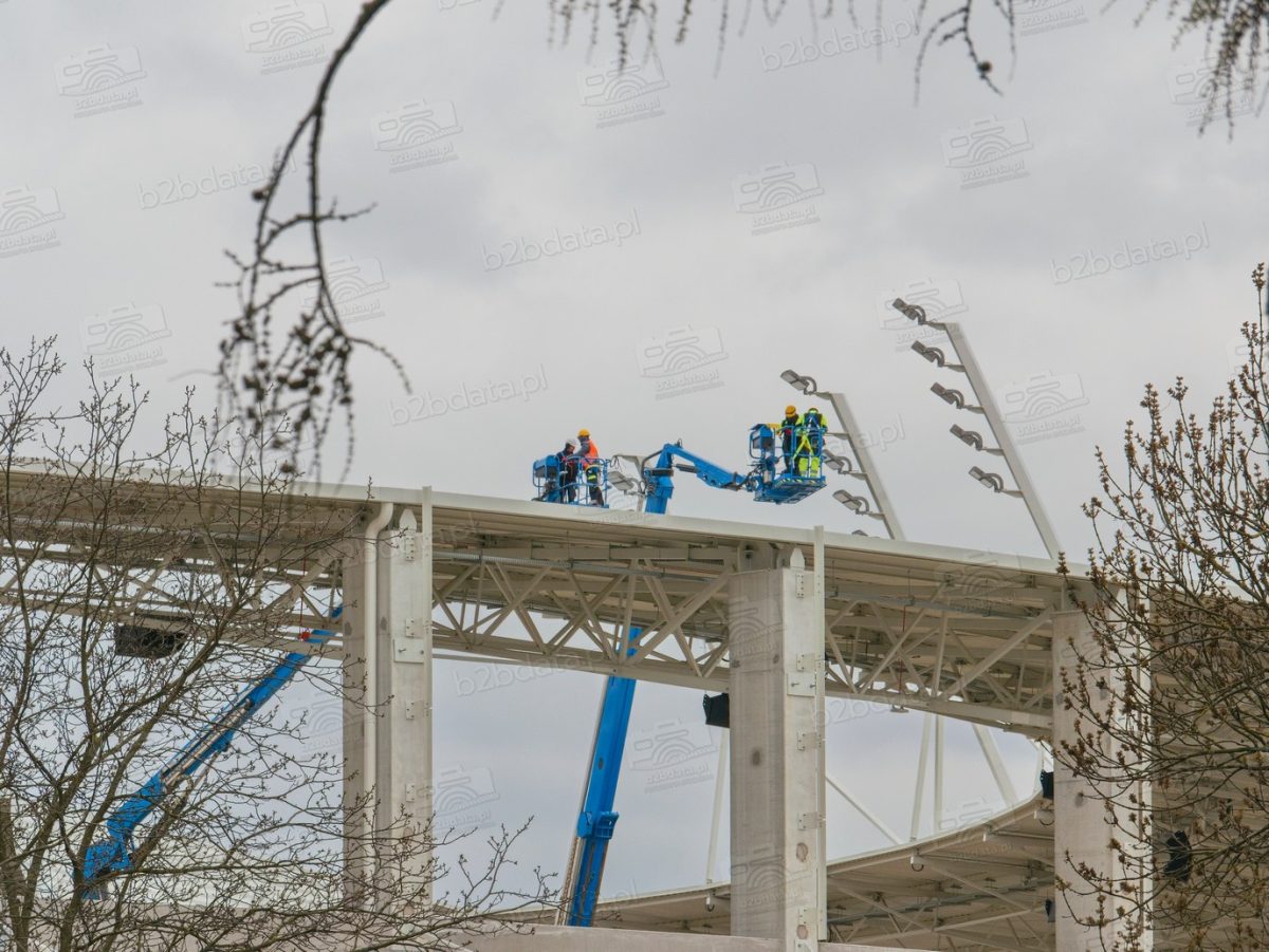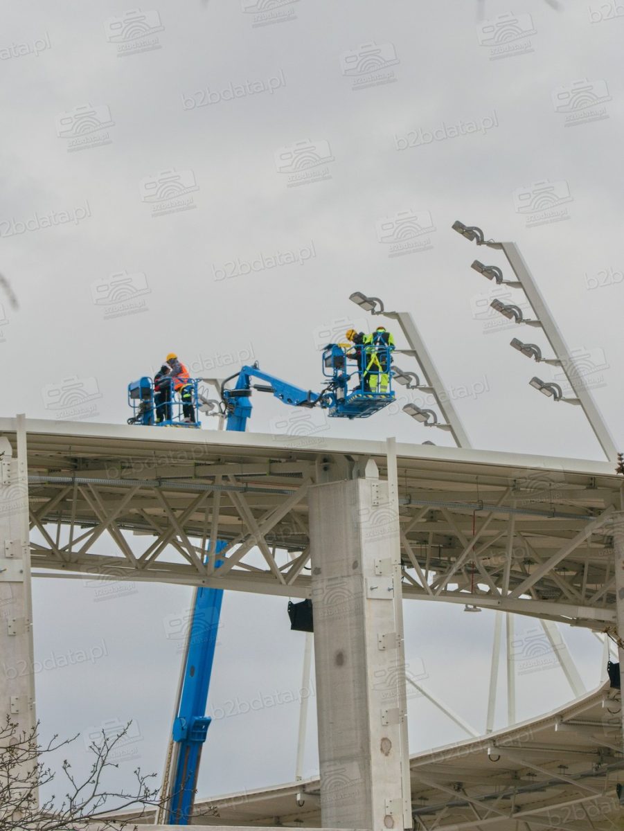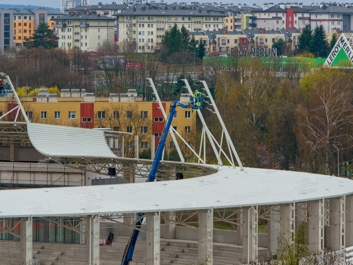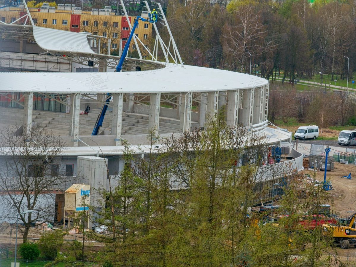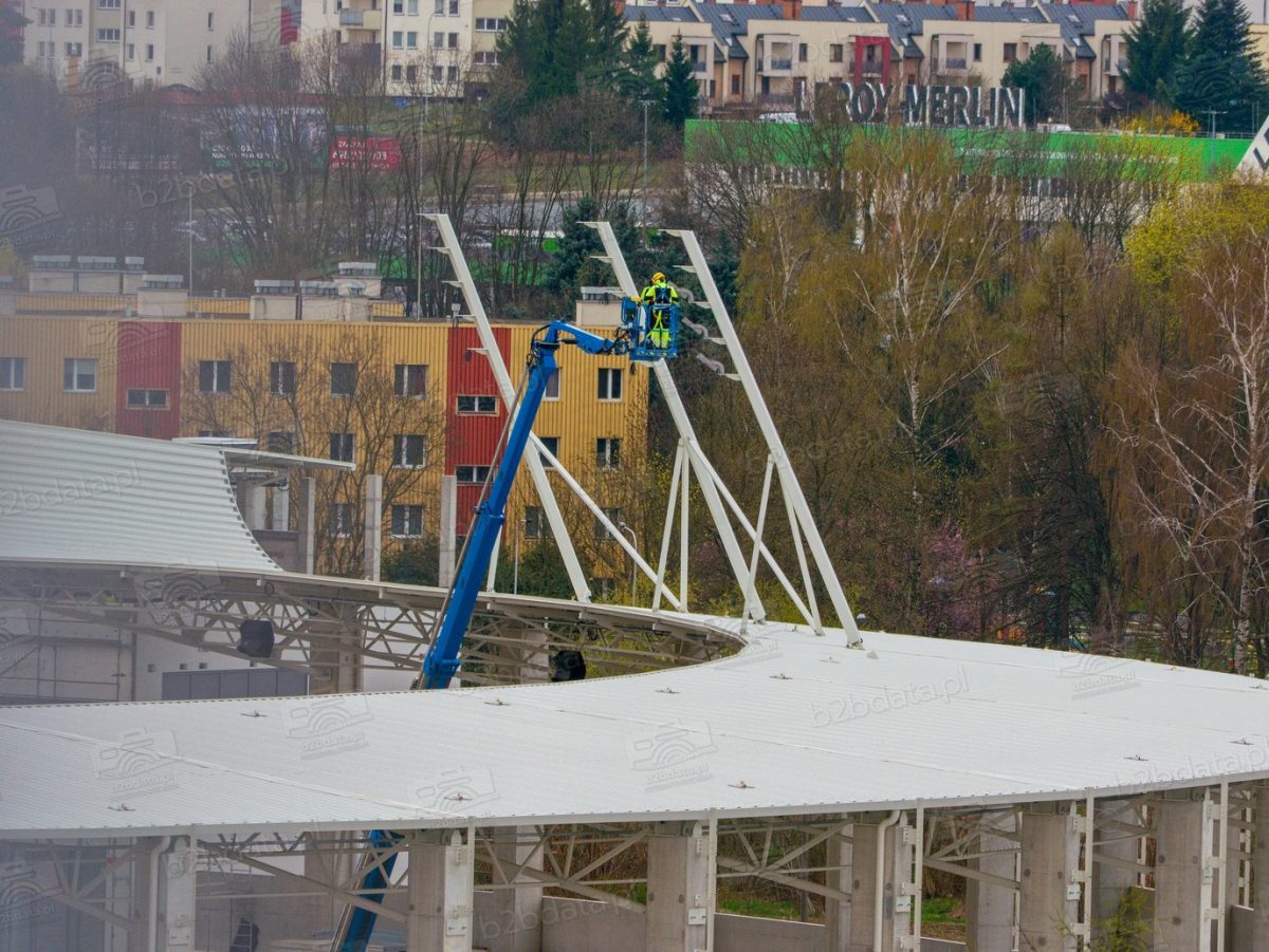 Wiosna 2026 roku przynosi kolejny widoczny kamień milowy na budowie Podkarpackiego Centrum Lekkoatletycznego w Rzeszowie. Dziś, 8 kwietnia, nad dachem nowego obiektu przy ul. Wyspiańskiego pracowały podnośniki koszowe, z których ekipy instalacyjne montują elementy systemu oświetleniowego.