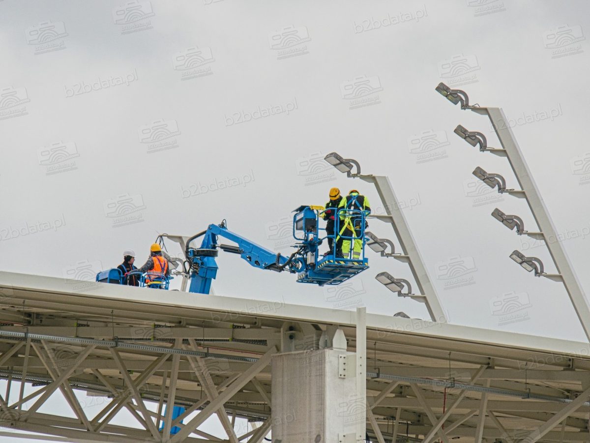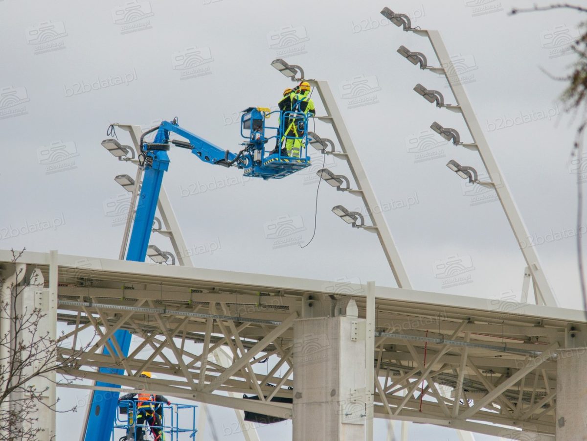 Montaż opraw na tak zaawansowanym geometrycznie obiekcie wymaga precyzji i specjalistycznego sprzętu. Prace przy masztach dachowych realizowane są z podnośników koszowych, które umożliwiają pracę na wysokości przy jednoczesnym zachowaniu pełnej kontroli nad mocowaniem i orientacją oprawy. Jest to typowa procedura przy obiektach tego typu.